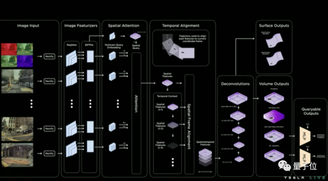 基于种种复杂场景,特斯拉方公布一个详细架构,让各路摄像头信号通过RegNets,却不同摄像头使用不同RegNet,再进入Special attention层,该架构同样适用于车辆、行人行为预测等场景。