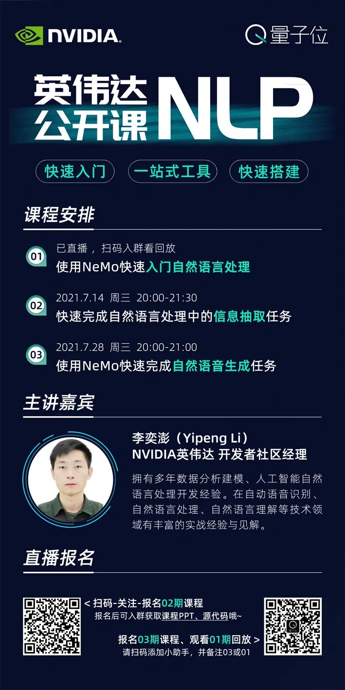 本周三晚8点,英伟达专家将通过理论讲解与代码演示,带大家快速入门NLP、分享如何使用NeMo快速实现NLP中的信息抽取任务。