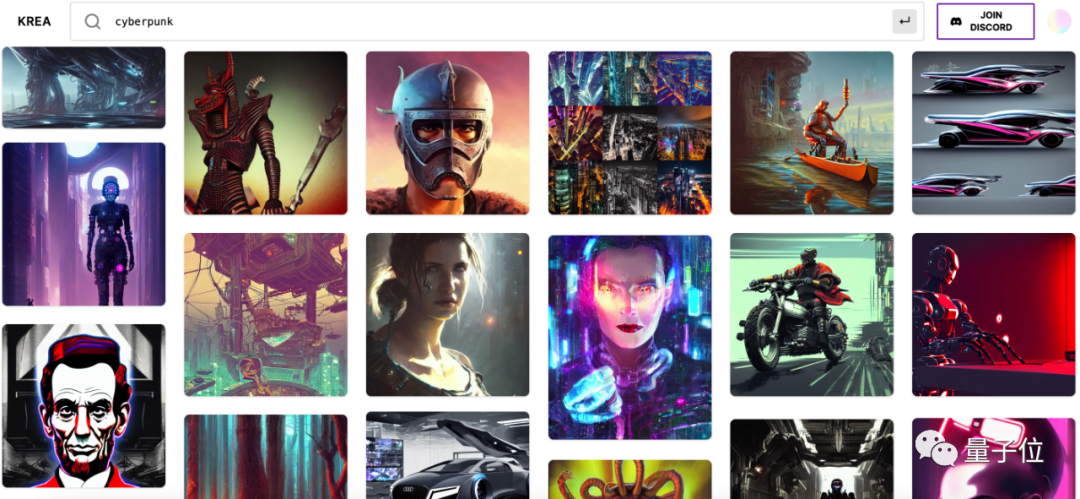 换一个平台KREA来看,输入关键词“赛博朋克”,出来的风格同样颇有现代感: