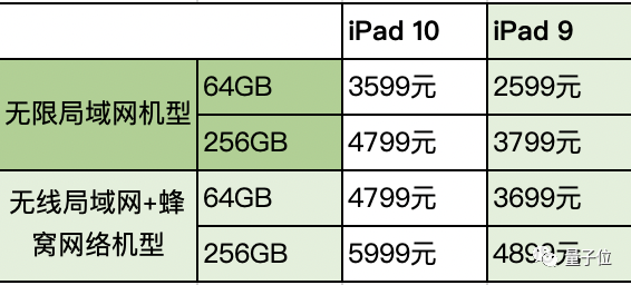 对比上一代iPad 9,同样容量下,无论是无线局域网机型还是无线局域网+蜂窝网络机型的起售价,都上涨了1000元。