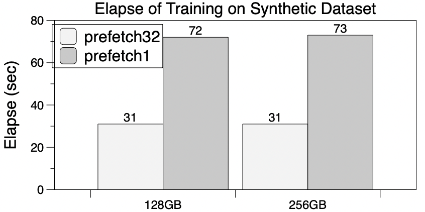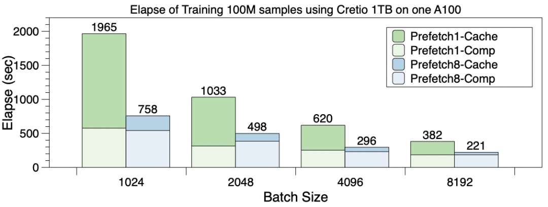 预取最显而易见的好处是减少了Step1和Step2的开销,使这个两步操作在总的训练过程占比小于5%。如【Cache操作的时间分解】所示,通过预取8个mini-batch数据,和没有预取的baseline相比,Cache查询的开销显著降低。