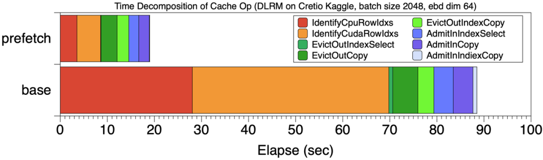和baseline Cache执行方式相比,图【Cache操作的时间分解】对比了prefetch 8个mini-batch和baseline的Cache时间分解。