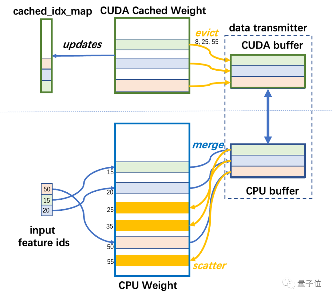 数据传输模块负责CUDA Cached Weight和CPU Weight之间的数据双向传输。