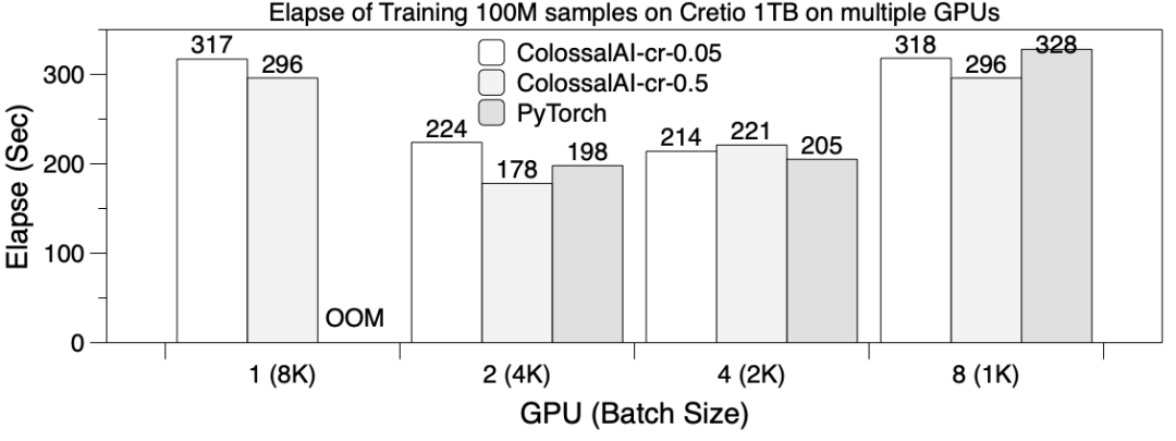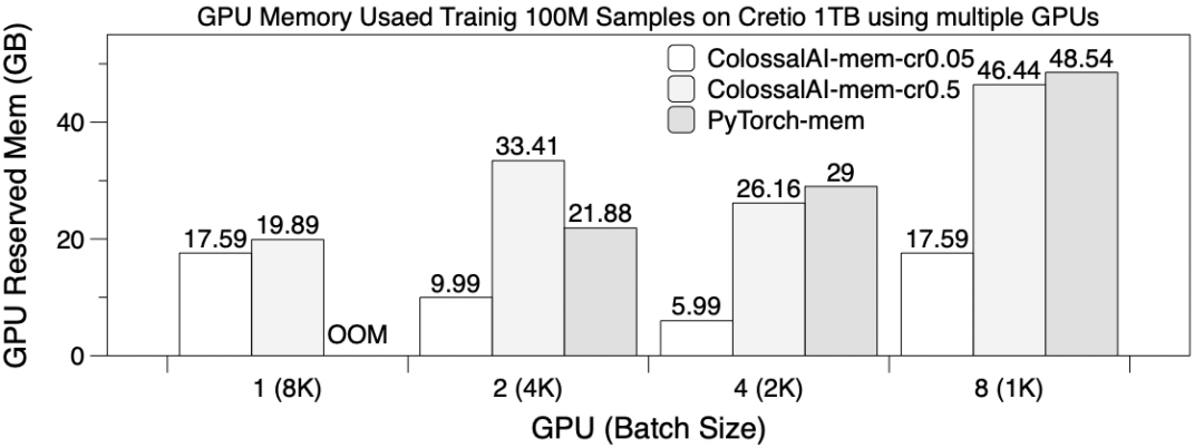 PyTorch由于显存内存不足无法在单卡A100上训练。作为对比, Colossal-AI的软件cache将显著降低GPU内存需求,足以训练大至256GB的嵌入表,并可进一步扩展至TB级别。