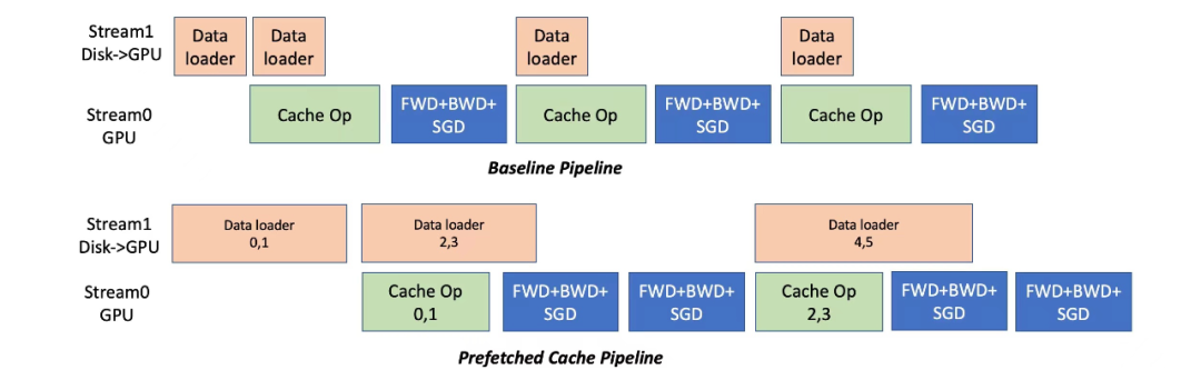 如下图所示,Colossal-AI使用预取来合并多个mini-batch数据统一进行Cache操作,同时采用流水线方式来重叠数据读取和计算的开销。