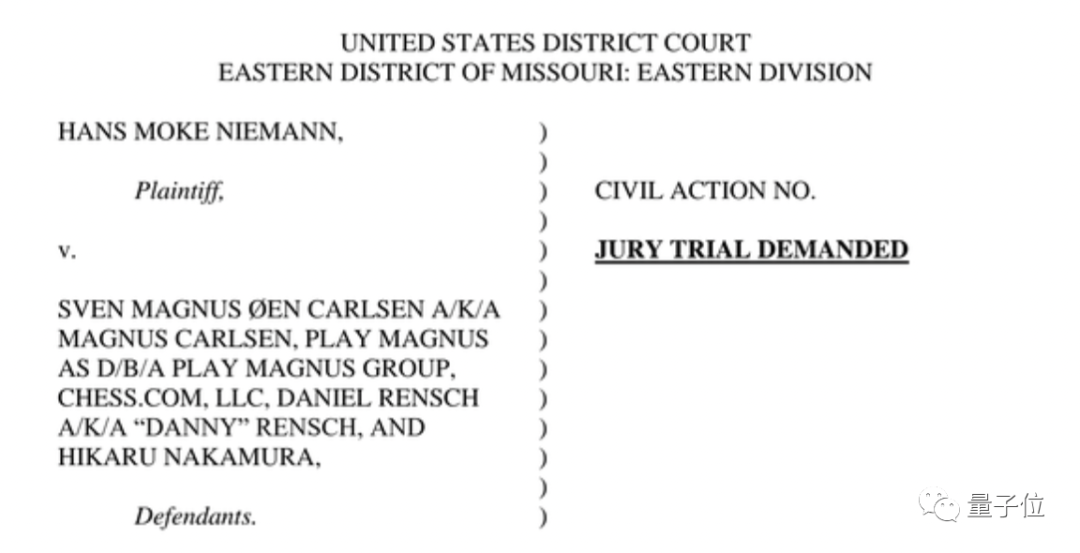 从总计44页诉讼内容中可以看到,此次尼曼共起诉了五个对象,其中卡尔森位居首位。
