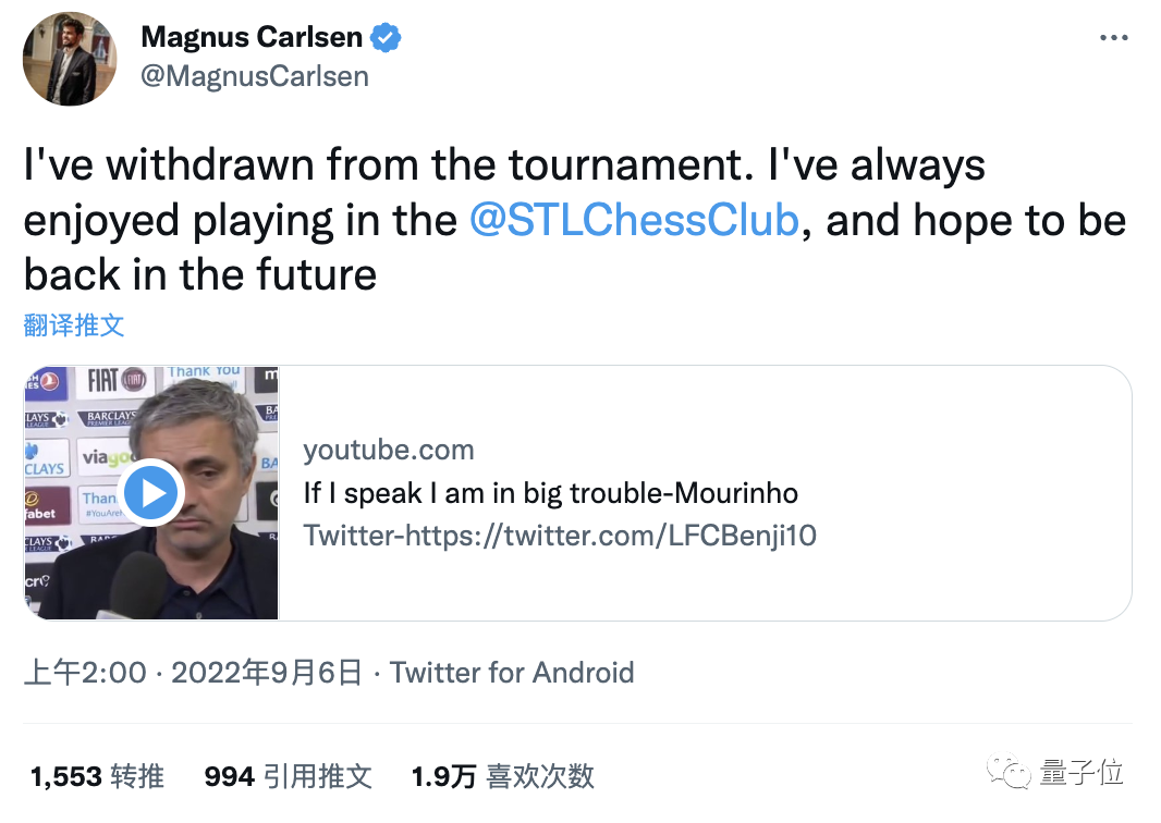 这一败让他直接、第一次做出了职业生涯中退赛的决定,并随后在推特上挂出了足坛名帅穆里尼奥的名场面视频,表达了“比赛水很深,如果我说了,我就有大麻烦” 的信息。