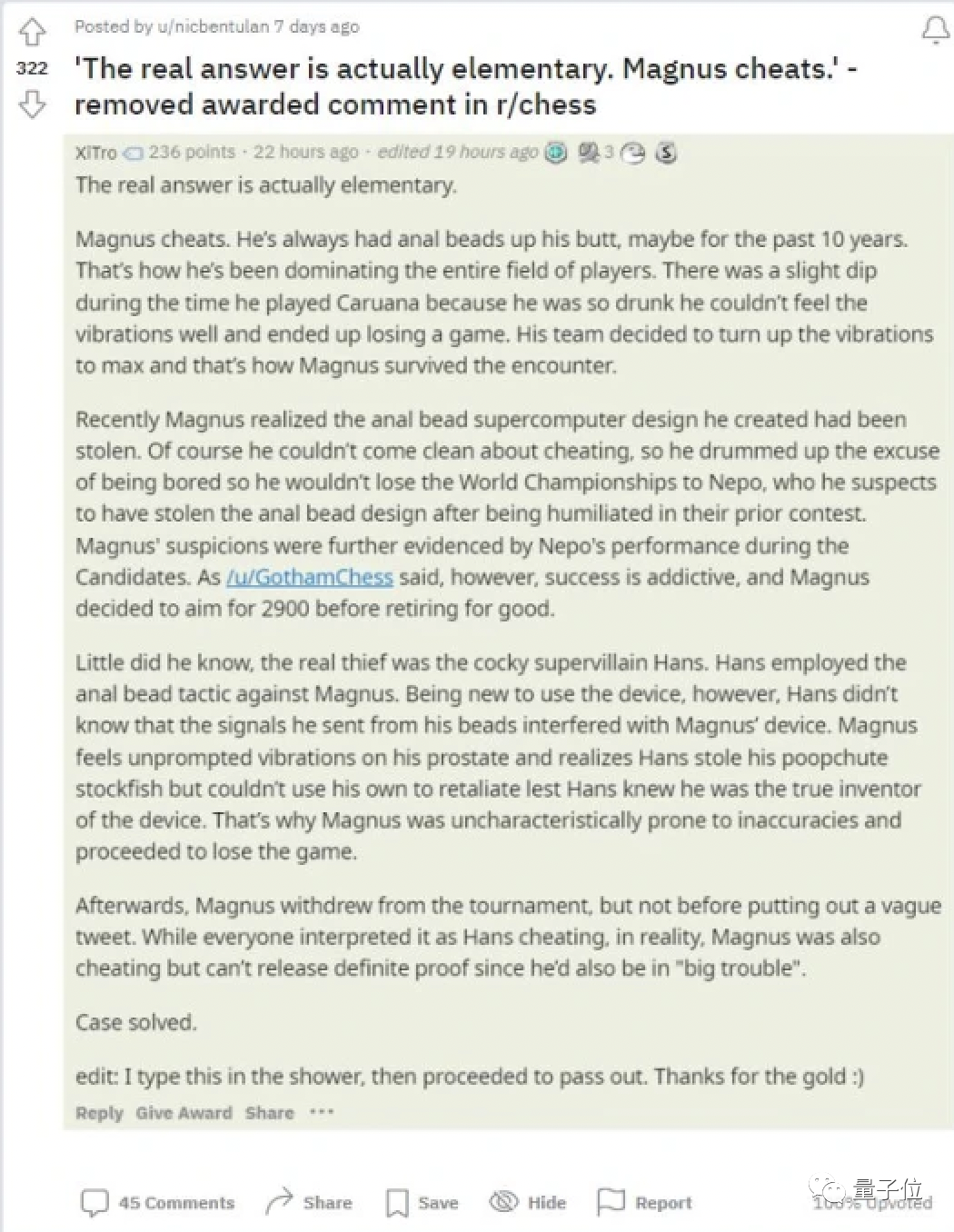 另一边,吃瓜网友们火速就位,不少国际象棋爱好者指出:“尼曼应该是用智能肛珠作弊”,于是乎这一说法瞬间在Reddit流传。