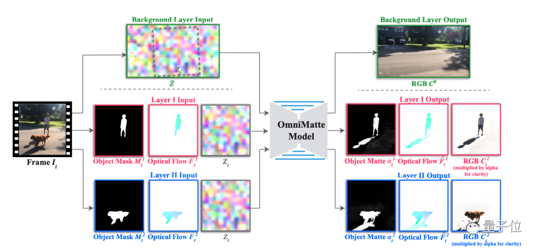 omnimatte模型是一个二维UNet,逐帧处理视频。每一帧都用现成的技术来计算物体掩码,来标记运动中的主体,并寻找和关联蒙版中未捕捉到的效果,比如阴影、反射或者烟雾,重建输入帧。