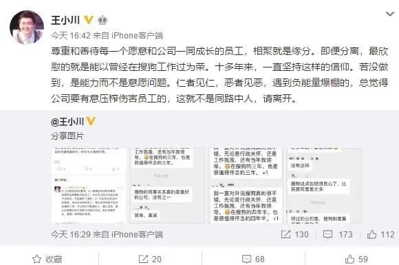 但当王小川告别信发出,他向7714个搜狐日夜、4083天搜狗CEO生涯道别时,得到的是所有人的祝贺和尊敬。