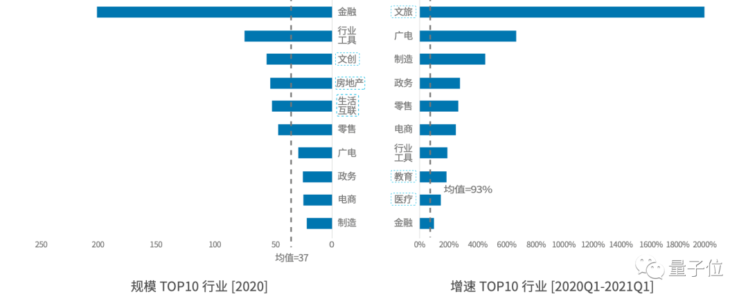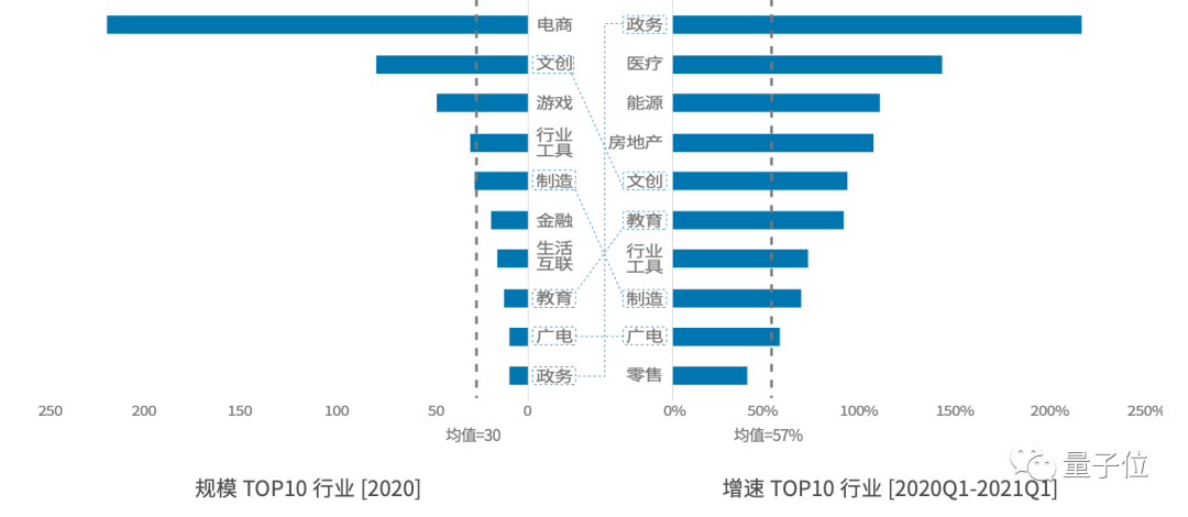 增速第一梯队中,新冠疫情促使大量政务、医疗应用上线,用云量增速居首,超200%和140%,是行业均值的4倍和2.5倍。