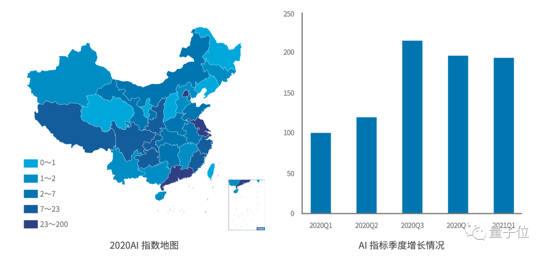 2020全年AI分省份均值达到20,第一梯队是北京、上海、广东三省,它们的AI指数占全国的七成。
