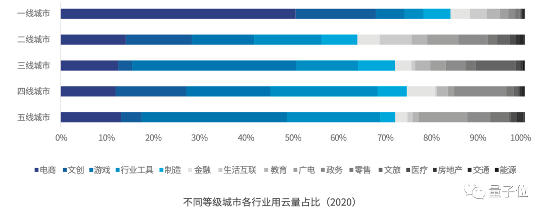 从城市看,在用云量规模上,排名前三的城市上海、北京、深圳的“用云量”大幅领先其他城市,连续几年稳居数字一线城市。