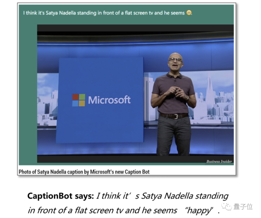 何晓冬带领团队开发的这款名为CaptionBot的AI 应用,精准描述了图片中纳德拉的言行举止,还能够描述人物情绪。