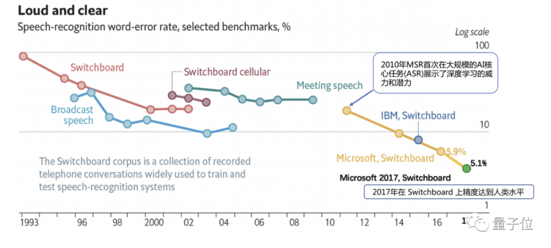 以Switchboard数据集上的语音识别性能测试为例,在此之前,基本错误率都高到没法在实际场景中大规模用起来。