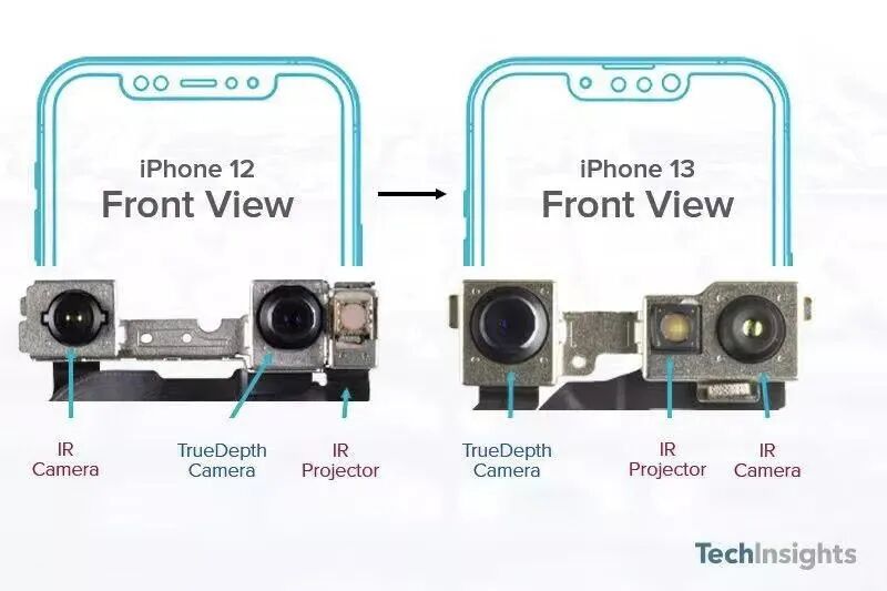 从iPhone拆解对比图上看,尽管iPhone 13的刘海已经缩小了不少,但苹果并没有打算放弃Face ID的元器件,只是让内部空间变得更加紧凑了。