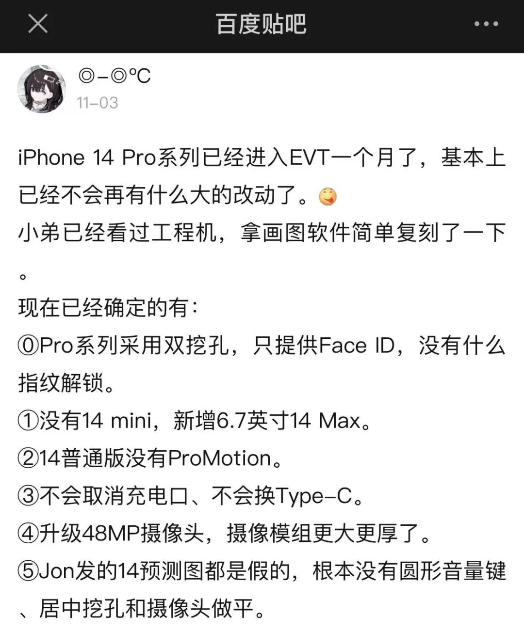 目前iPhone 14 Pro系列已经进入EVT(工程验证测试)一个月了,基本上不会再有什么大的改动。如果工程机属实的话,这条爆料还是具有一定的参考价值的。