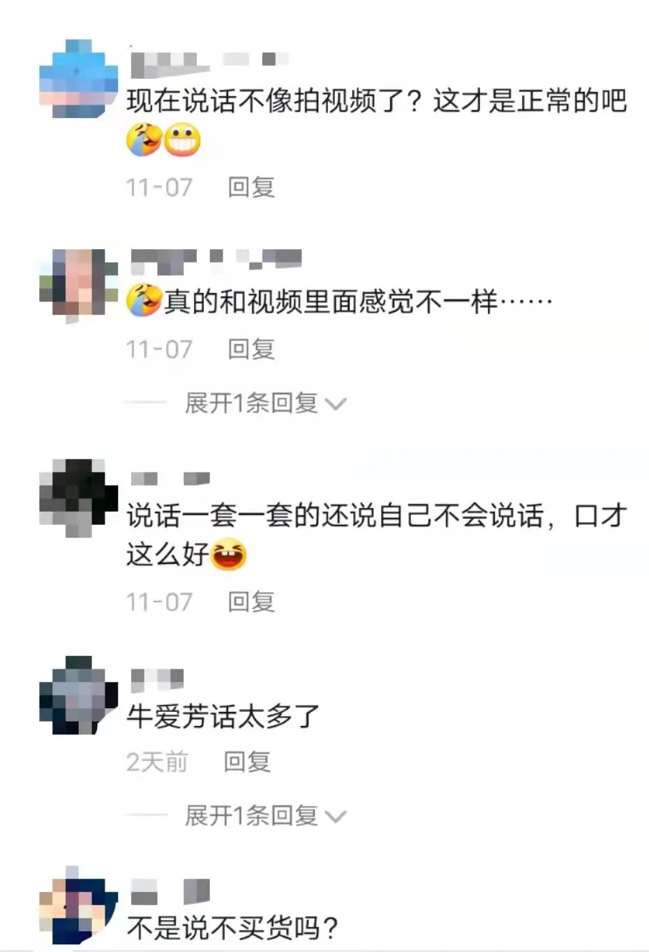 还有粉丝质疑,在直播间里的牛爱芳讲话流畅通顺,甚至还一直因为产品问题和商家吵架。一点也不像视频中那个说话一顿一顿的木讷丈夫。