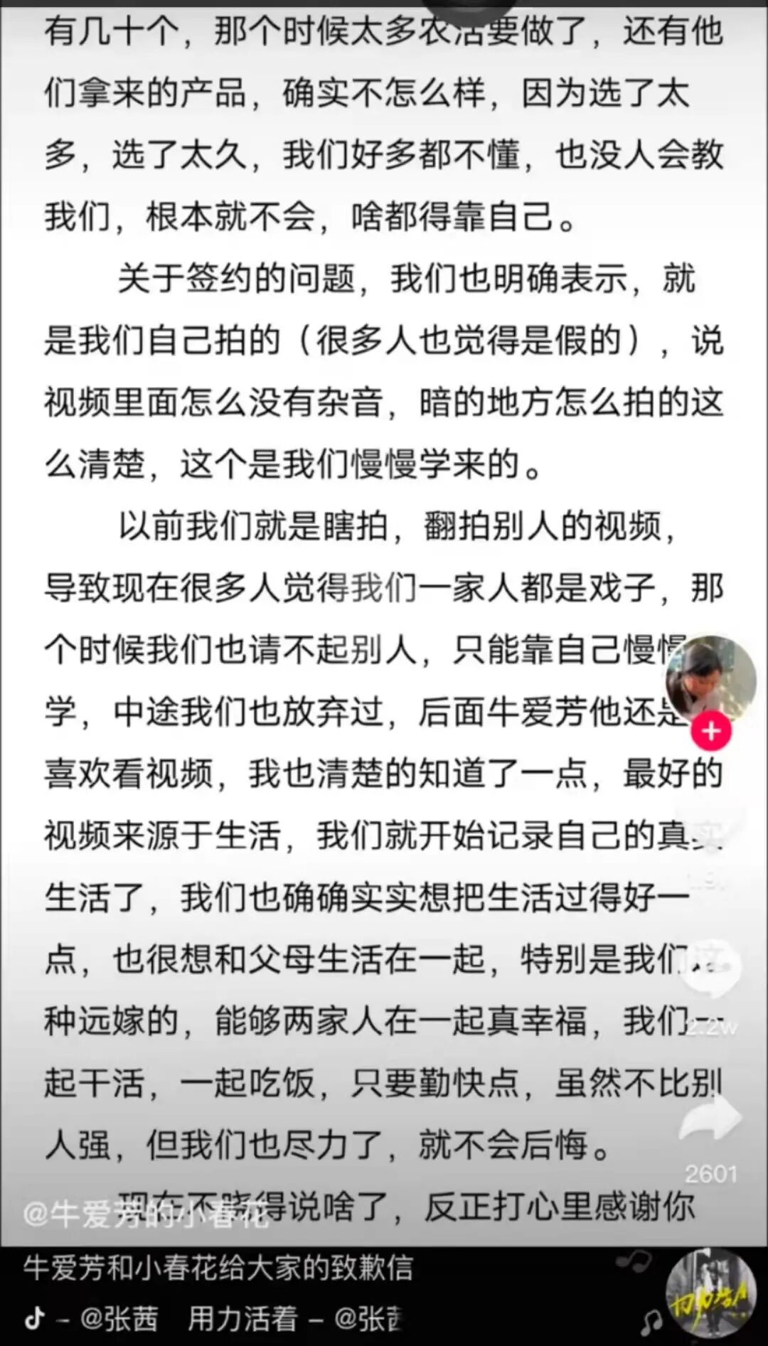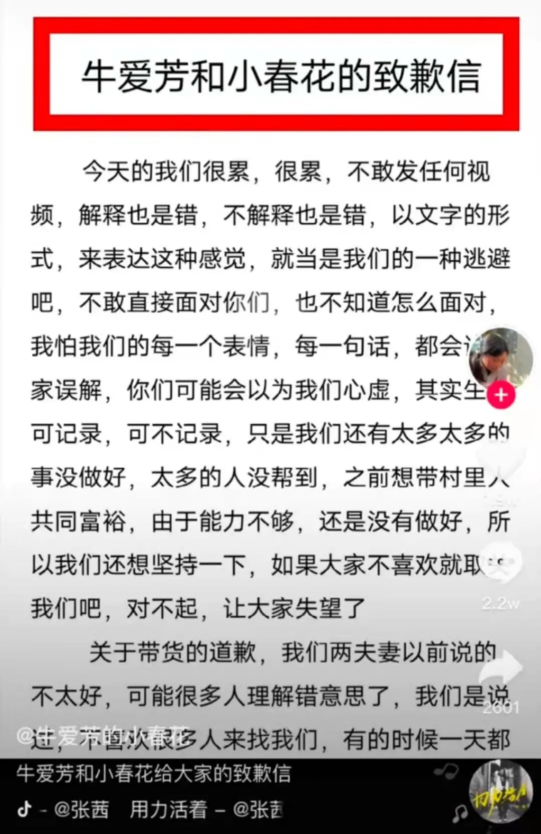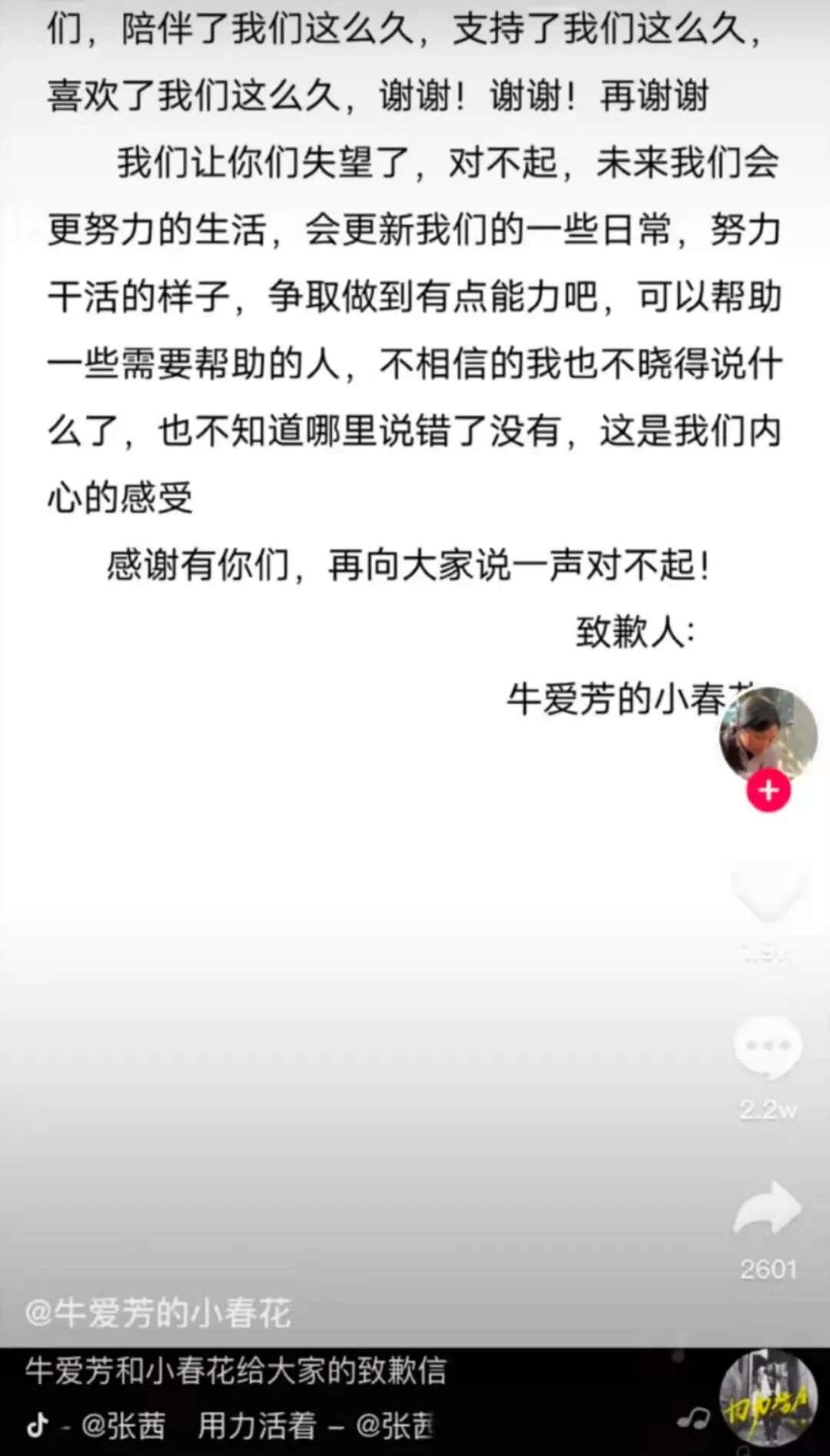 牛爱芳和小春花也坐不住了,发布了一篇致歉信。