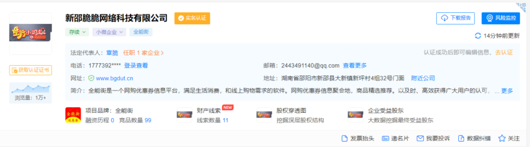 但根据网传消息,确实有家“新邵脆脆网络科技有限公司”的小微企业老板叫章脆,也在湖南邵阳。