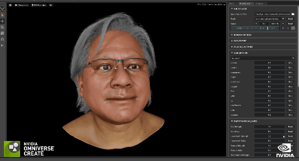 然后再设计表情和动作,利用Audio2Face技术,让AI自动同步表情,再根据真人的表情做调整,这是重中之重,为的就是让他的表情和神态能欺骗所有人。