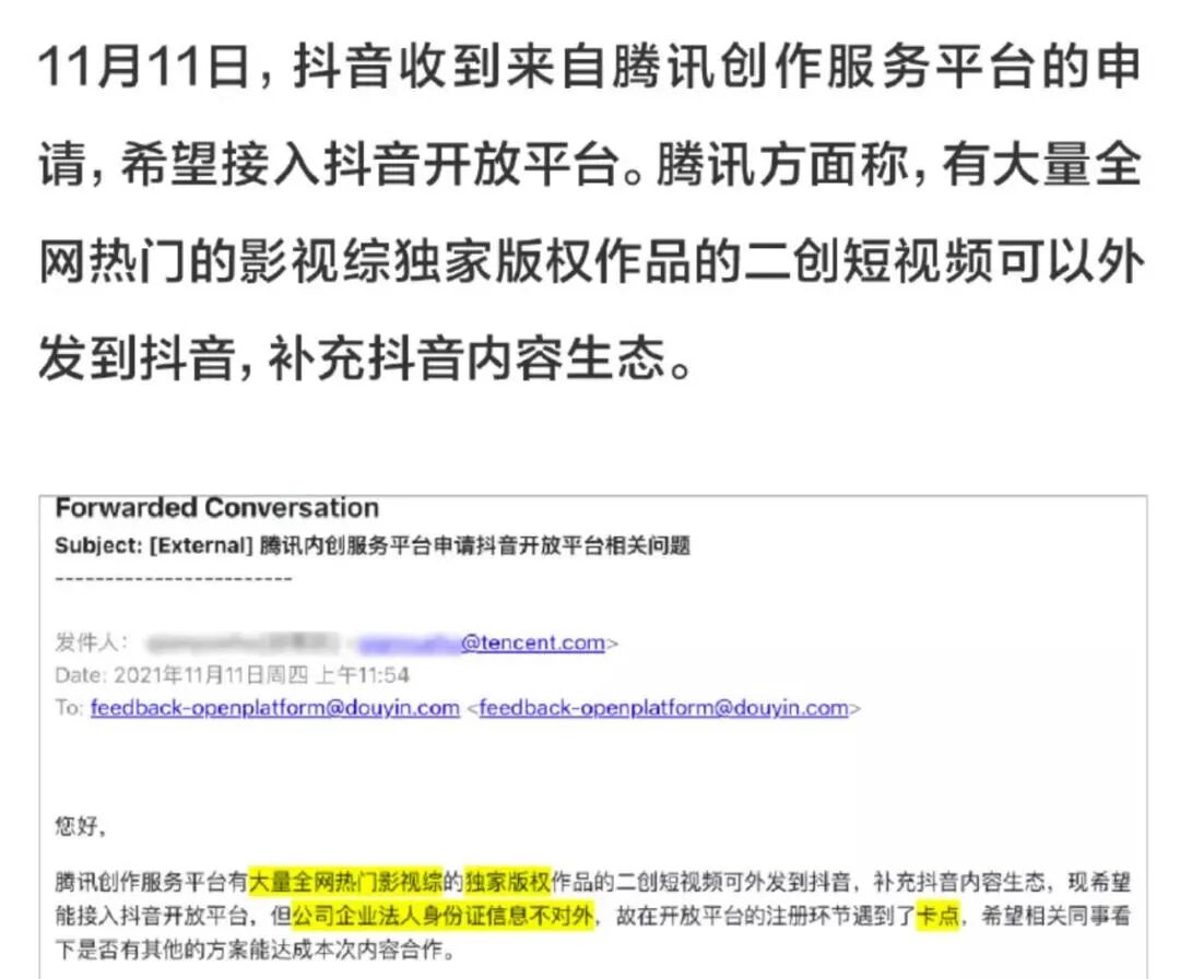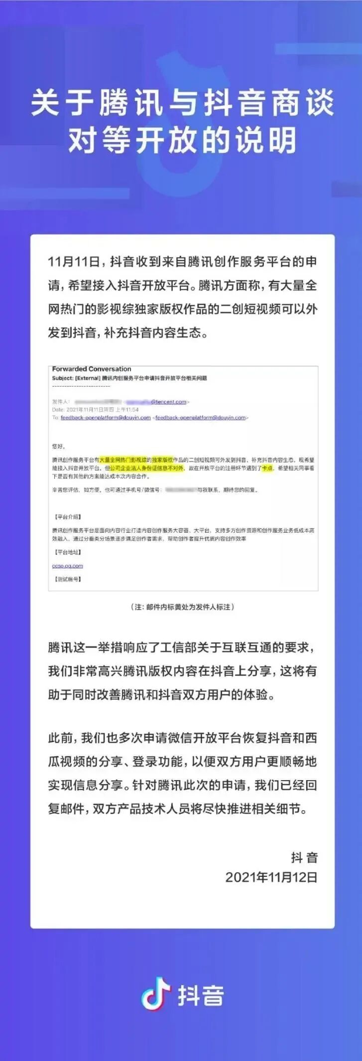 抖音官方账号发布了一则《关于腾讯与抖音商谈对等开放的说明》,公开了腾讯创作服务平台发来的一封邮件,并在声明中放出了与通讯沟通的邮件截图。
