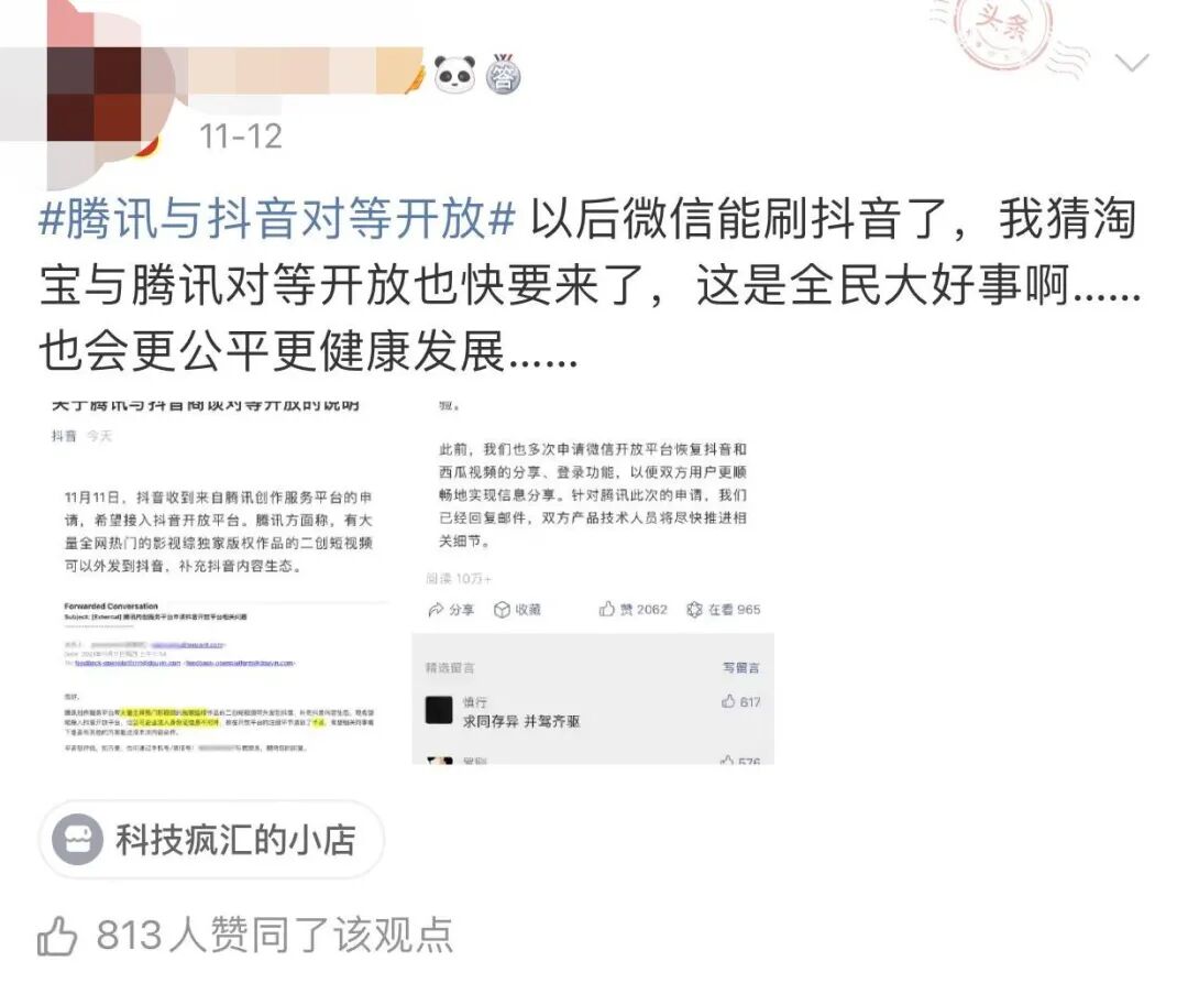 潮评社:抖音腾讯释放开放意向,是响应政策尊重用户之举