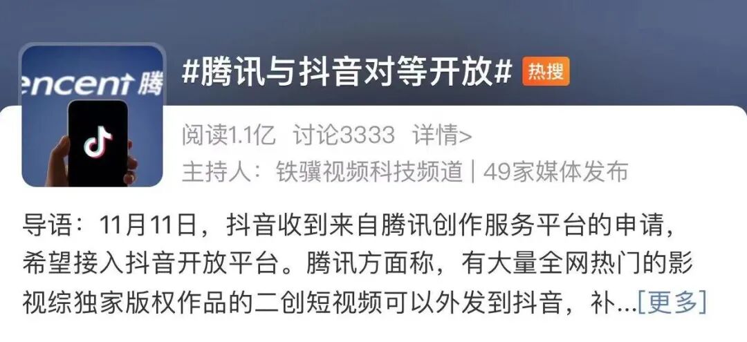 11月12日晚间,#腾讯与抖音商谈对等开放#悄悄登上了微博热搜榜,引发不少网友热议。