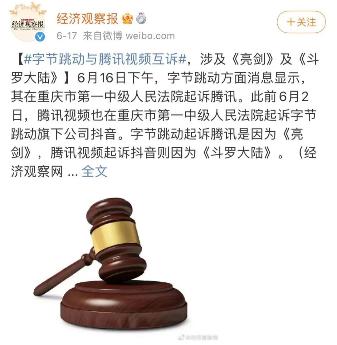 另一方面抖音母公司字节跳动也因为短视频侵权问题,起诉过腾讯,原因是腾讯视频上长期存在着《亮剑》的短视频剪辑侵权视频,索赔1000万元。