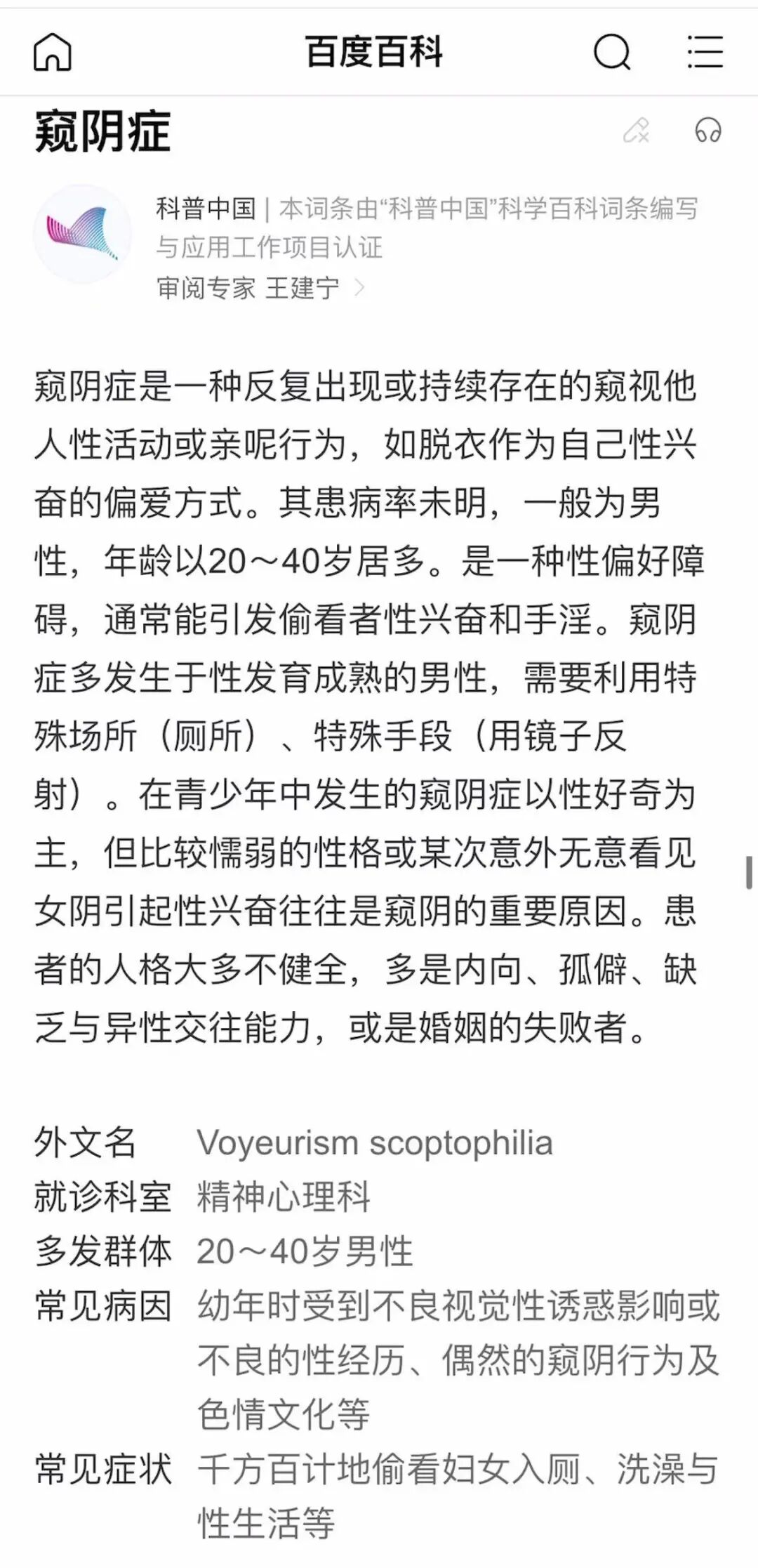其实,这种人的变态心理已经属于一种心理疾病,叫做“窥阴症”。