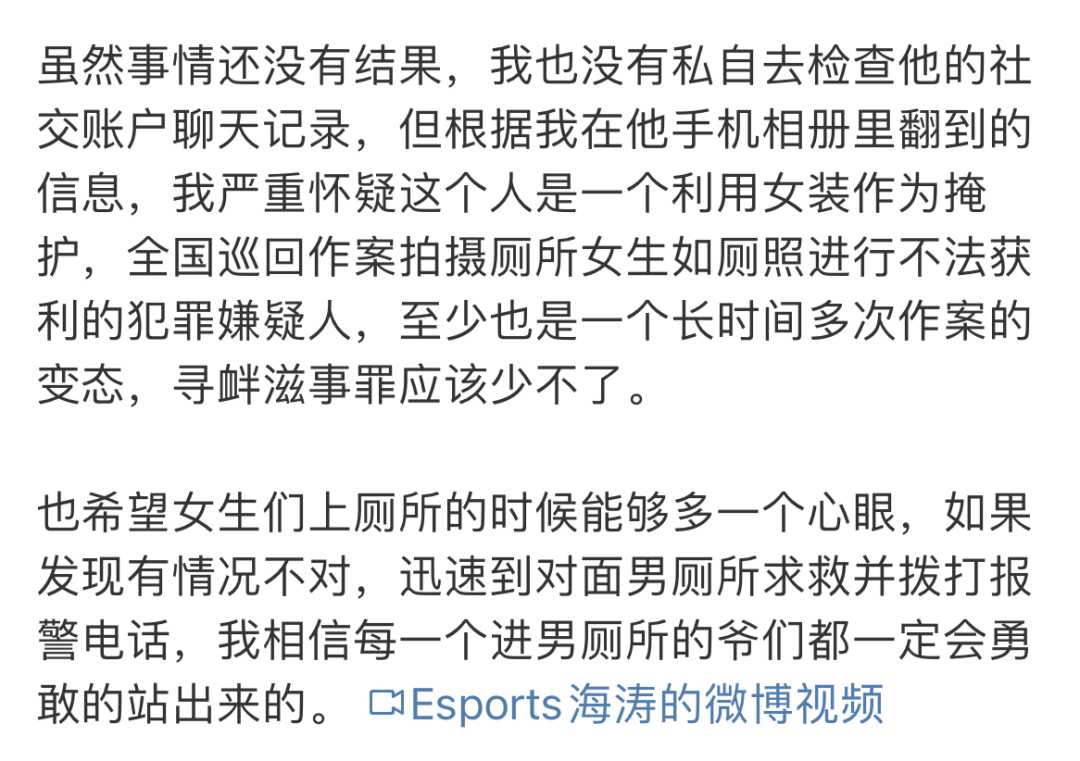 @Esports海涛 还表示,希望女生们上厕所的时候能够多一个心眼,“我相信每一个进男厕所的爷们都一定会勇敢的站出来的”。