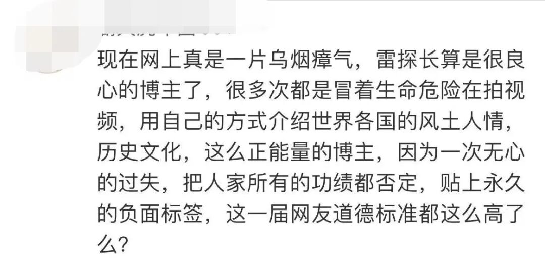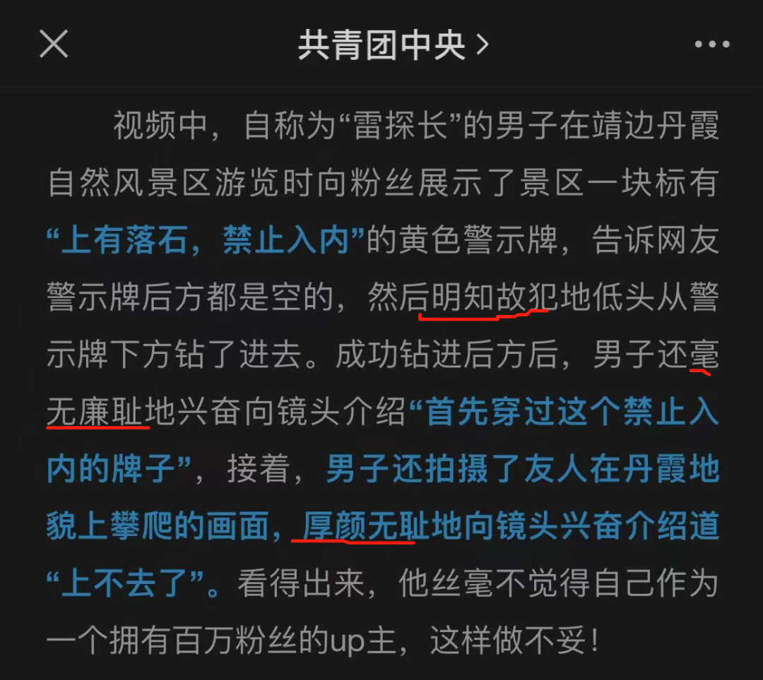 视频发布后,“冒险雷探长”受到了舆论批评。@共青团中央 的文章中,用“明知故犯”“毫无廉耻”“厚颜无耻”来形容他。