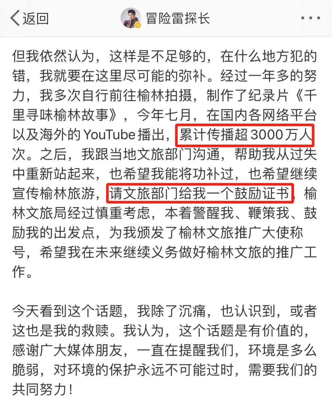 他再次为自己去年踩踏丹霞地貌表示道歉,并表示自己觉得光道歉是不够的,希望在什么地方犯的错可以尽可能的弥补,于是近一年来多次自行前往榆林拍摄,制作了纪录片《千里寻味榆林故事》,累计传播超过3000万。之后,他跟当地文旅部门沟通,希望文旅部门给自己一个鼓励证书,希望自己能够继续义务做好榆林文旅的推广工作。