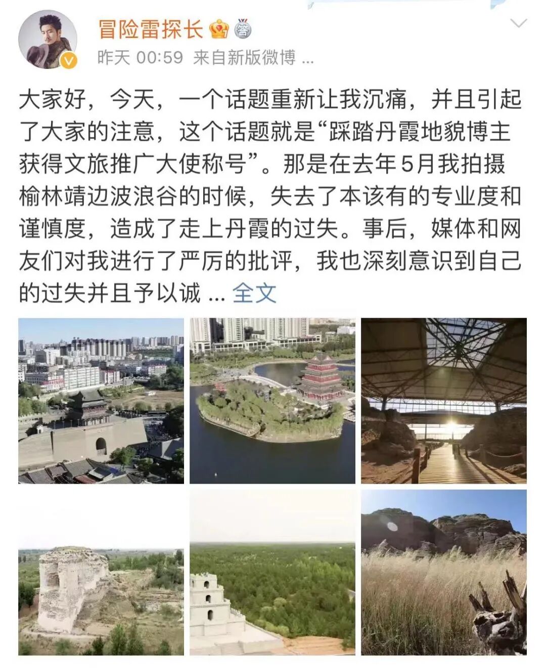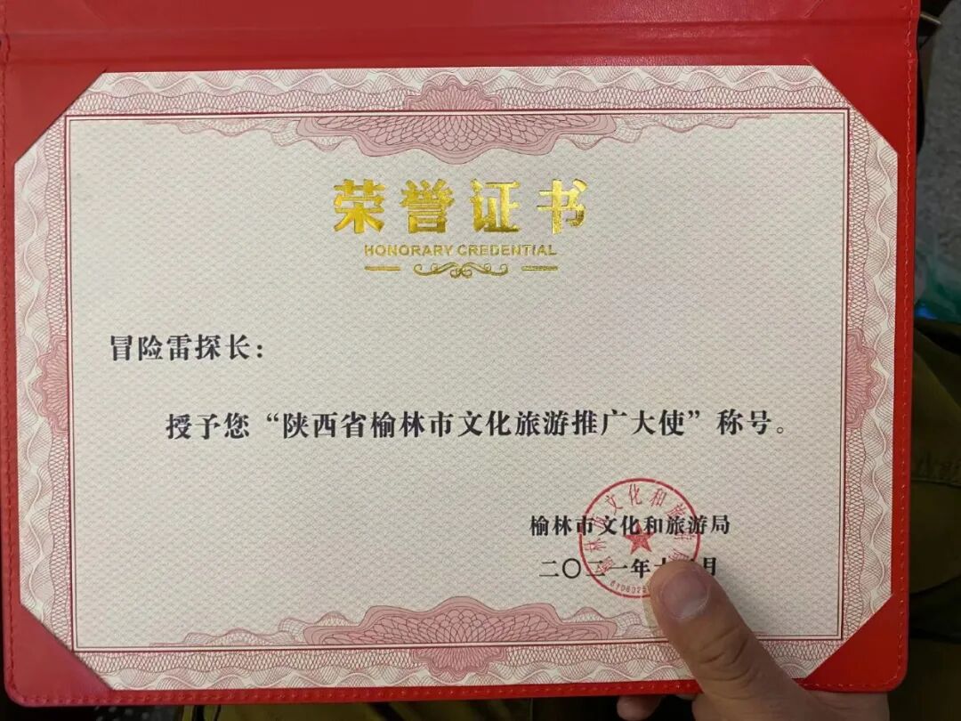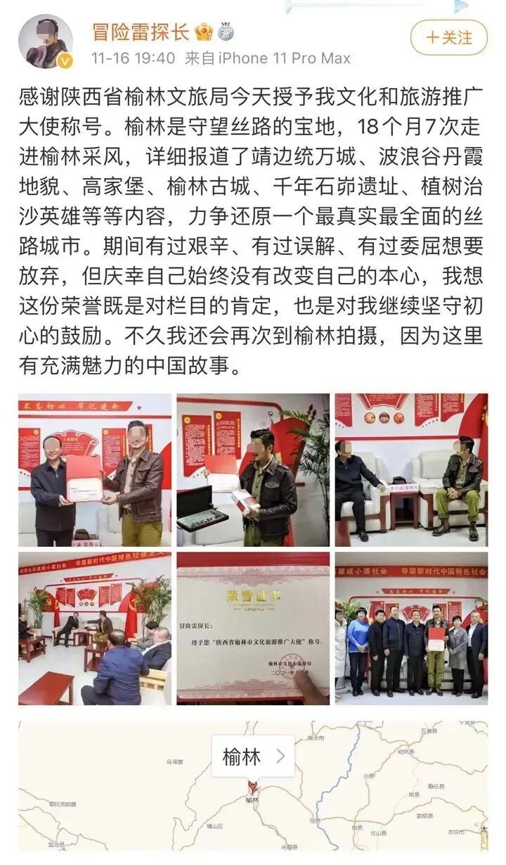 之所以今天给大家介绍这种自然景观,是因为前几天,网红博主“冒险雷探长”了个微博,表示他被陕西省榆林市文旅局授予“文化和旅游推广大使”称号。