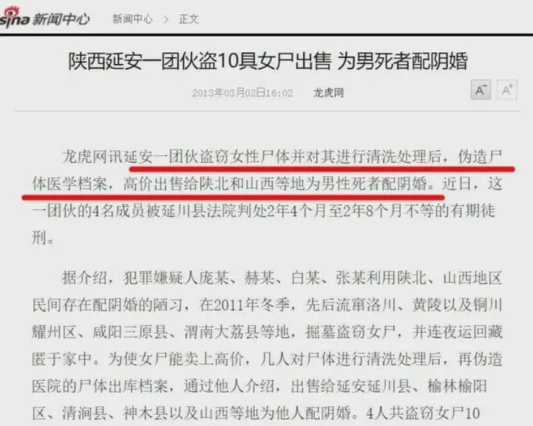 《中国新闻周刊》曾做过调查报道,称在我国一些省份存在着冥婚利益链,年轻女性尸体是明码标价的。
