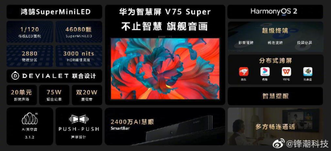 这次的华为 电视 智慧屏V75 Super采用华为自研鸿鹄Super MinLED屏幕,除了超高亮度和2880个独立分区外,还拥有20单元的帝瓦雷音响系统。