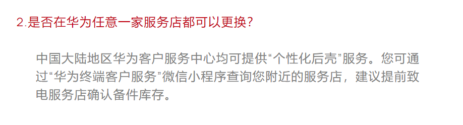 这项服务可以简单理解为:给你已经入手的华为手机买一个新的手机后壳,并且免费换上去。所以,该服务适用于那些手机后壳已经摔坏的用户。