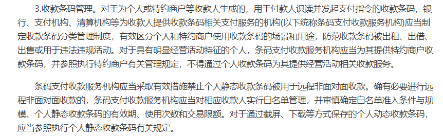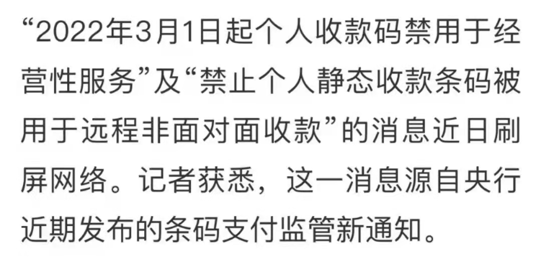 “2022年3月1日起个人收款码禁用于经营性服务”及“禁止个人静态收款条码被用于远程非面对面收款”。
