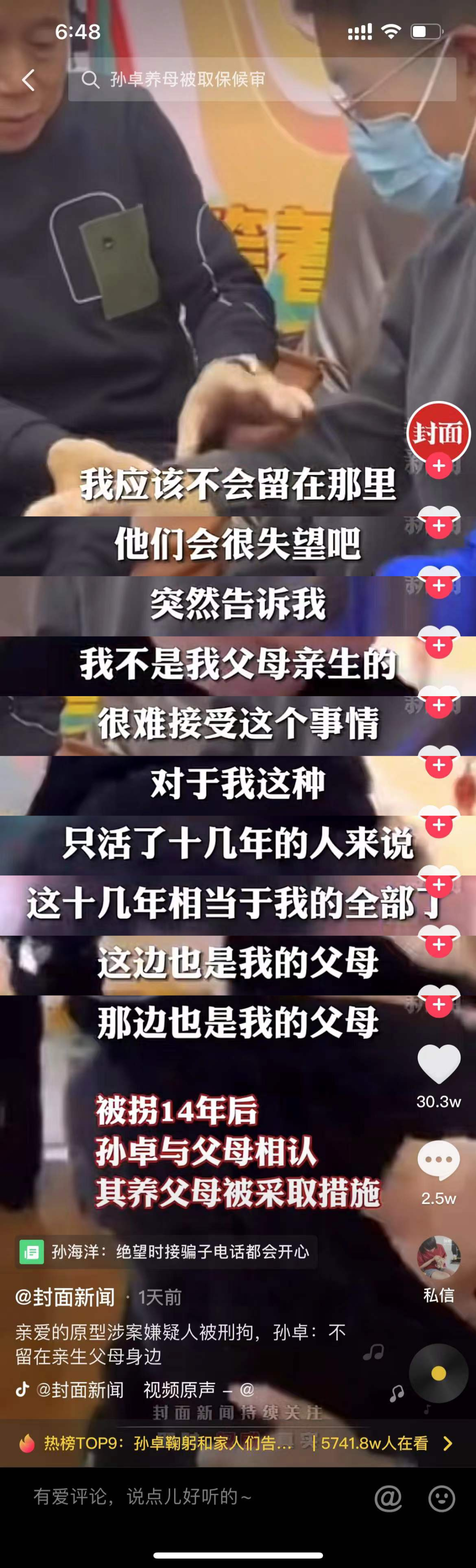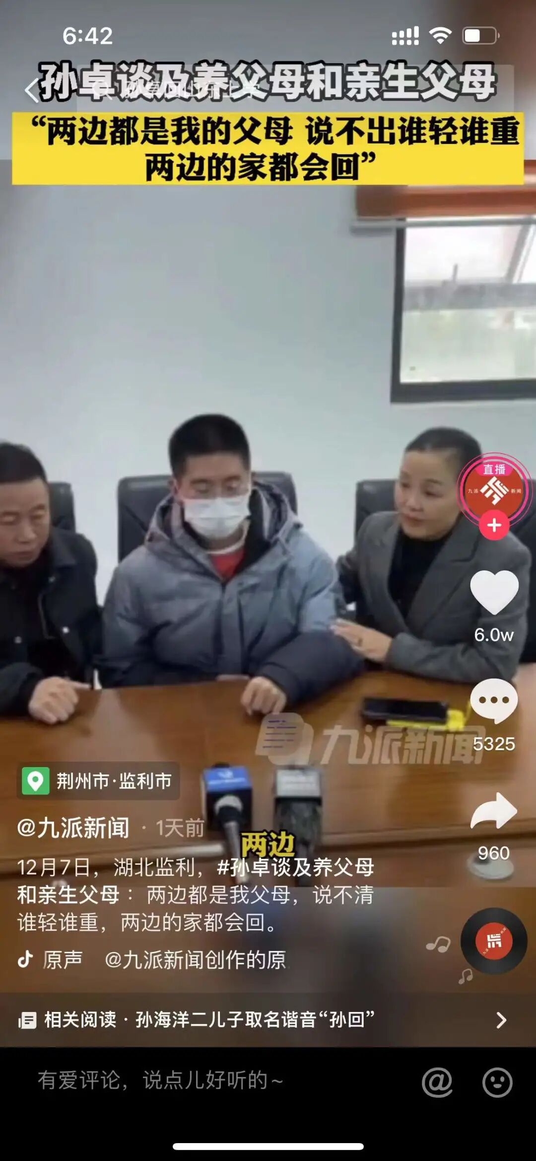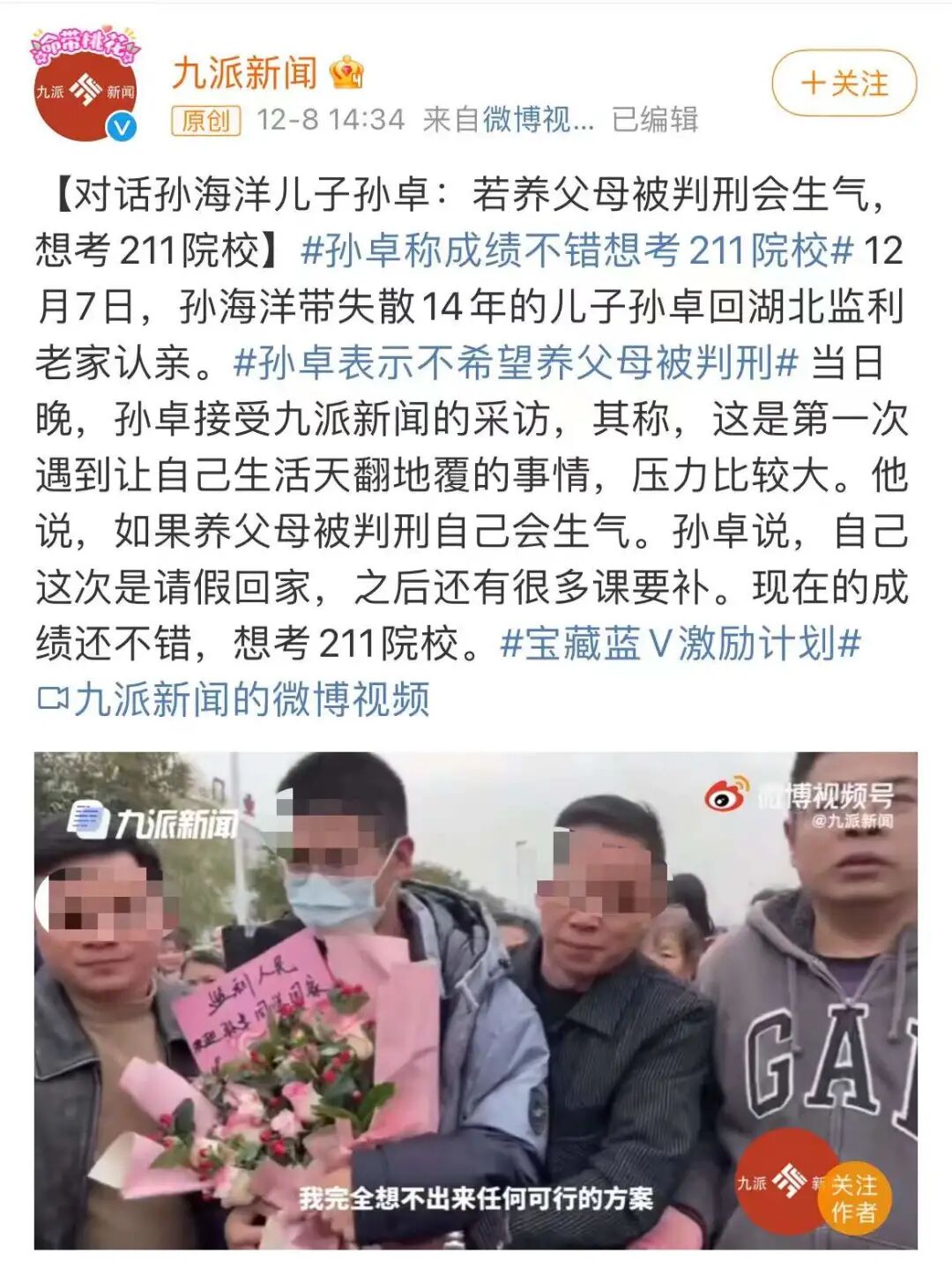 孙卓在接受采访时表示,自己一个月前才知道是被收养的,知道这个事实后,对“养父母”没有产生过恨意。“对于我来说,两边都是我的父母,说不上谁轻谁重”“两边的家都会回”。