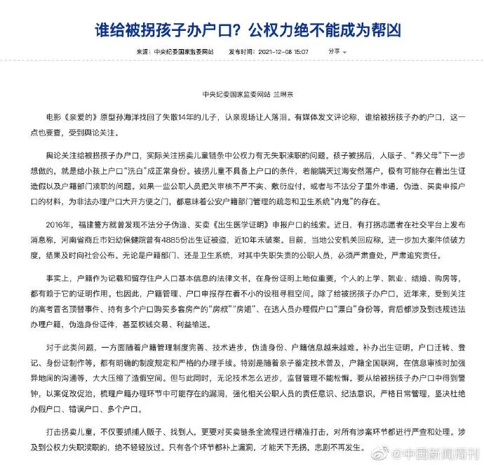中纪委发文:谁给被拐孩子办的户口,这一点也要查。