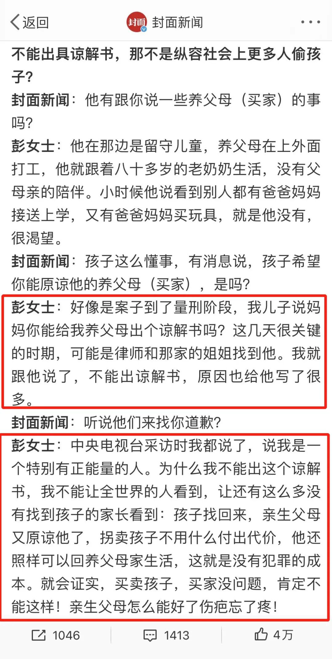 最近“养父母”那边的姐姐和律师找到符建涛,希望这边能出一个“谅解书”,符建涛的生母拒绝了,因为出具了谅解书,是在纵容更多人偷孩子,亲生父母怎么能好了伤疤忘了疼!