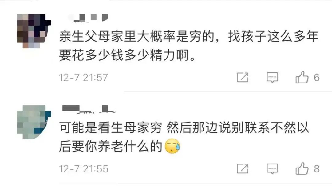 有人开始恶意揣度这个孩子嫌亲生母亲家里穷。