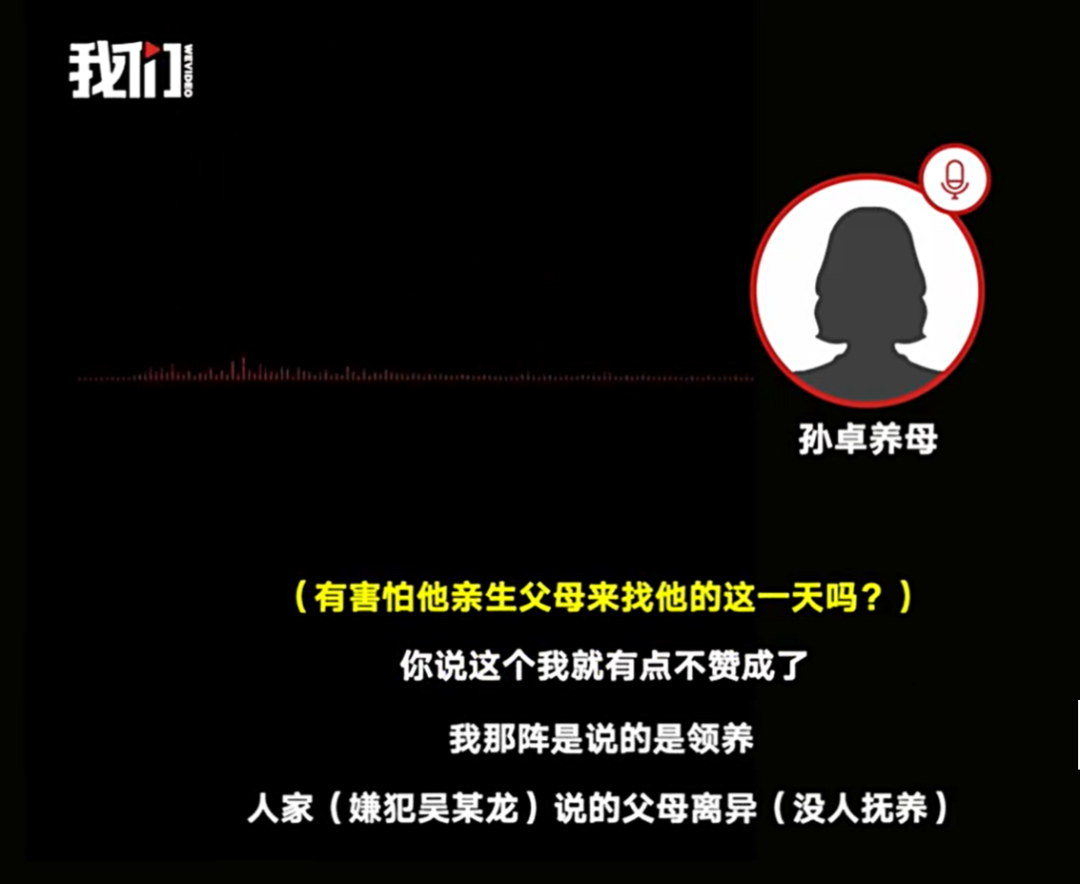 但!是!孙卓的“养母”却说,当时吴某某说的是“父母离异(没人抚养)”。