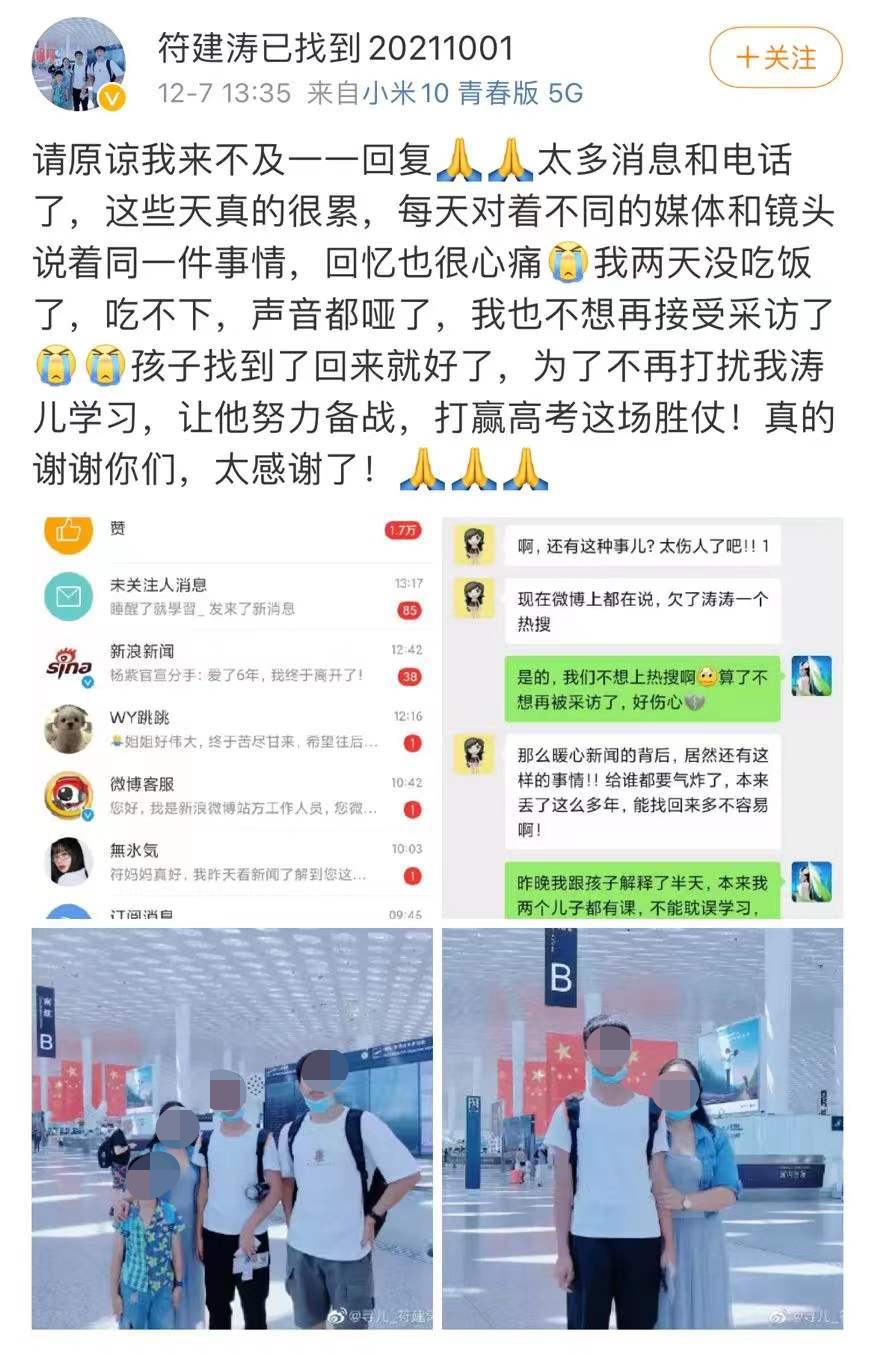符建涛的母亲表示,“每天对着不同的媒体和镜头说着同一件事情,回忆也和心痛”,“不想再接受媒体采访了,孩子找到了回来就好”。