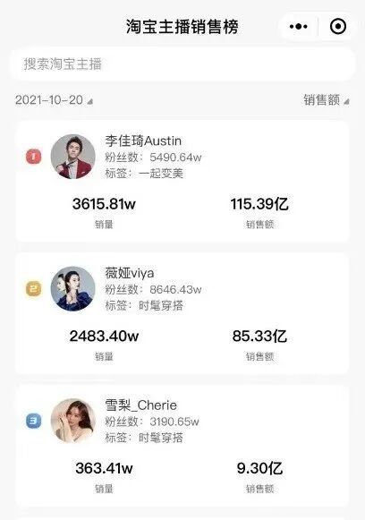 据今年的双十一消息,雪梨直播间10月20号的预售首战就创造了9.3亿的销售额!仅次于薇娅和李佳琦,稳居第三宝座。