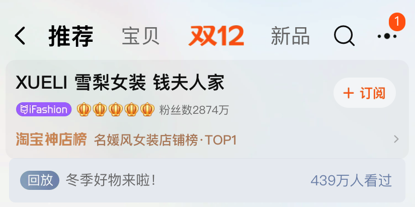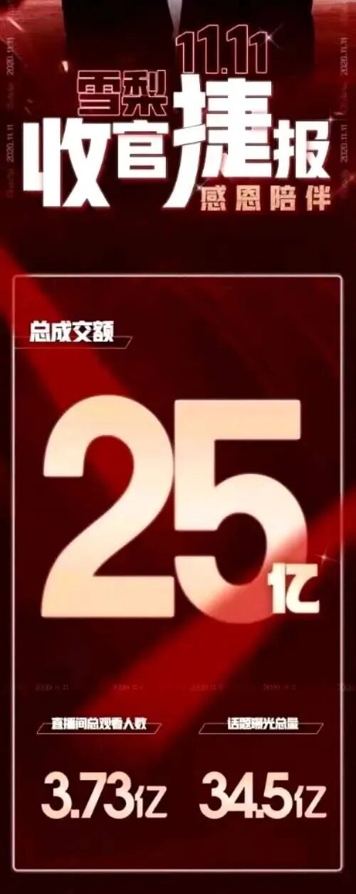 而在去年双十一期间,雪梨在淘宝直播带货的总成交额达25亿元,直播间总观看人数3.73亿,话题曝光总量34.5亿。