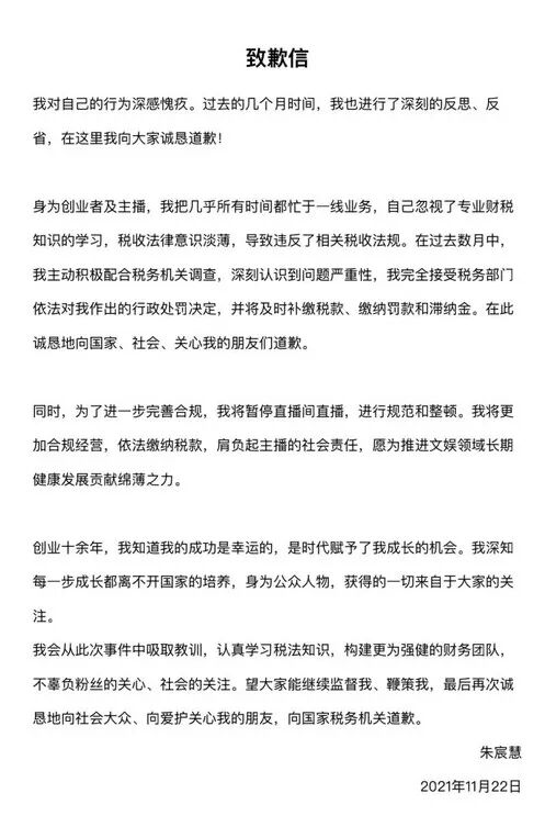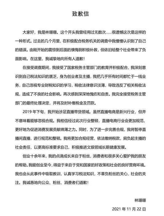 在处罚公告发布后,雪梨和林珊珊先后发表了致歉信。自白:“是税收法律意识浅薄的错,已经深刻意识到问题的严重性,马上交罚款停播整顿,感谢粉丝支持……”