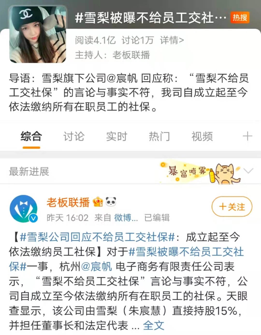 不仅如此,最近网上还曝出一条消息,称“雪梨公司不给员工交社保”!