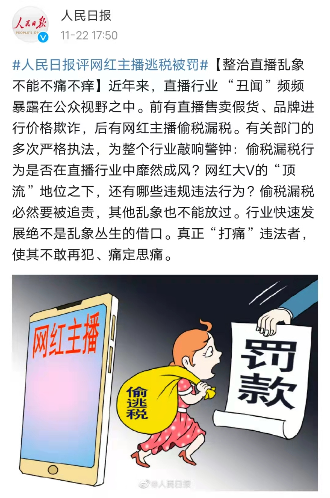 比如《人民日报》就表示:“整治直播乱象不能不痛不痒。偷税漏税必然要被追责,其他乱象也不能放过!”