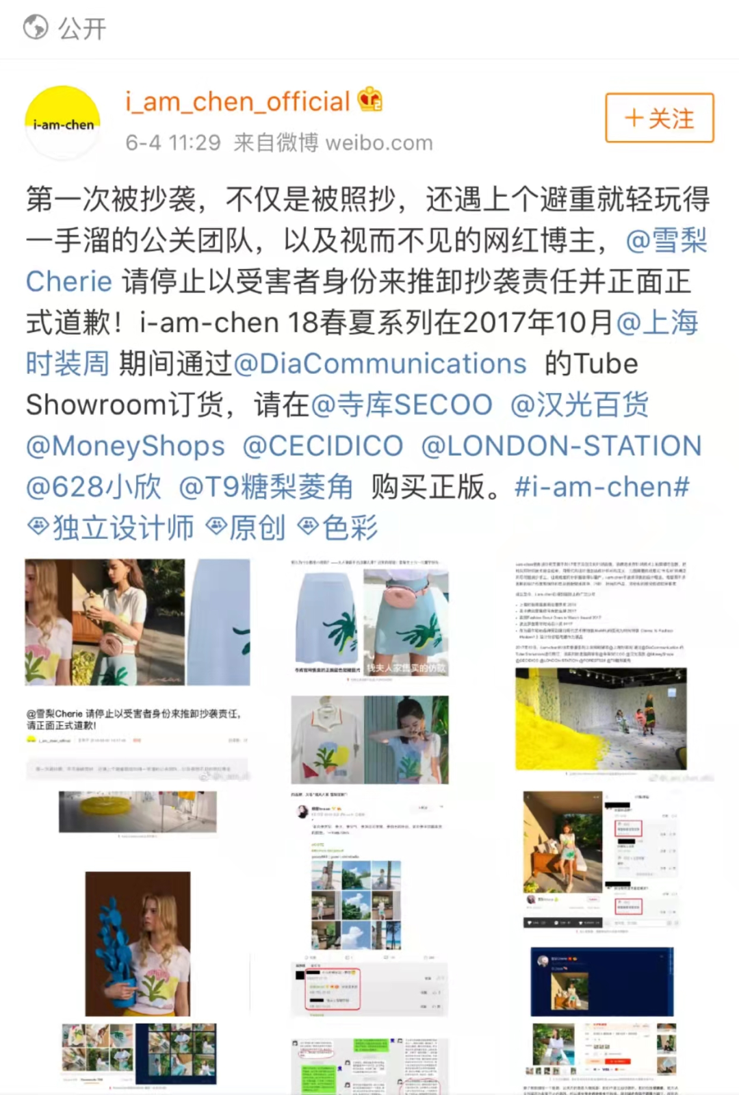 早前被抄袭的i_am_chen_official品牌就曾在微博发文,要求雪梨公开道歉。他们认为雪梨对抄袭持默认态度、装作视而不见,雪梨的公关团队拒不认错,避重就轻强行嘴硬。